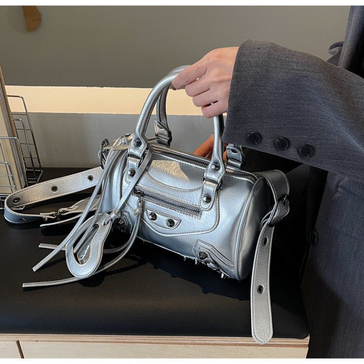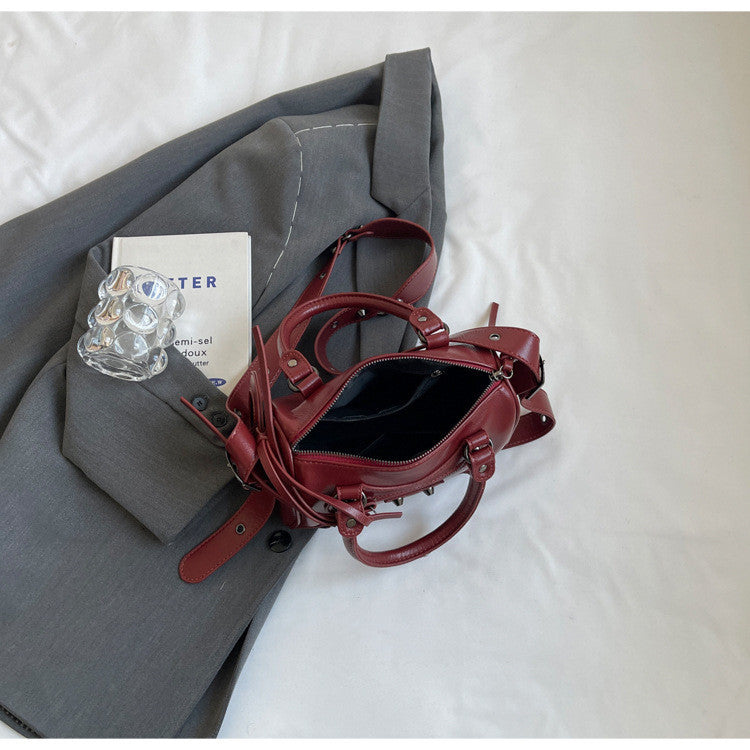 Ielgy High-End Rivets Hot Girl Style Texture Boston Handbag Niche One-Shoulder Messenger Motorcycle Bag