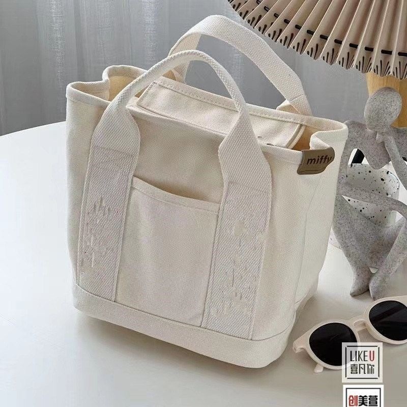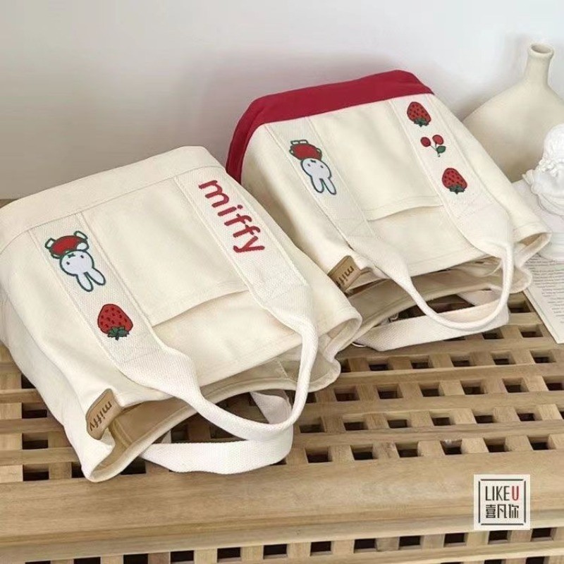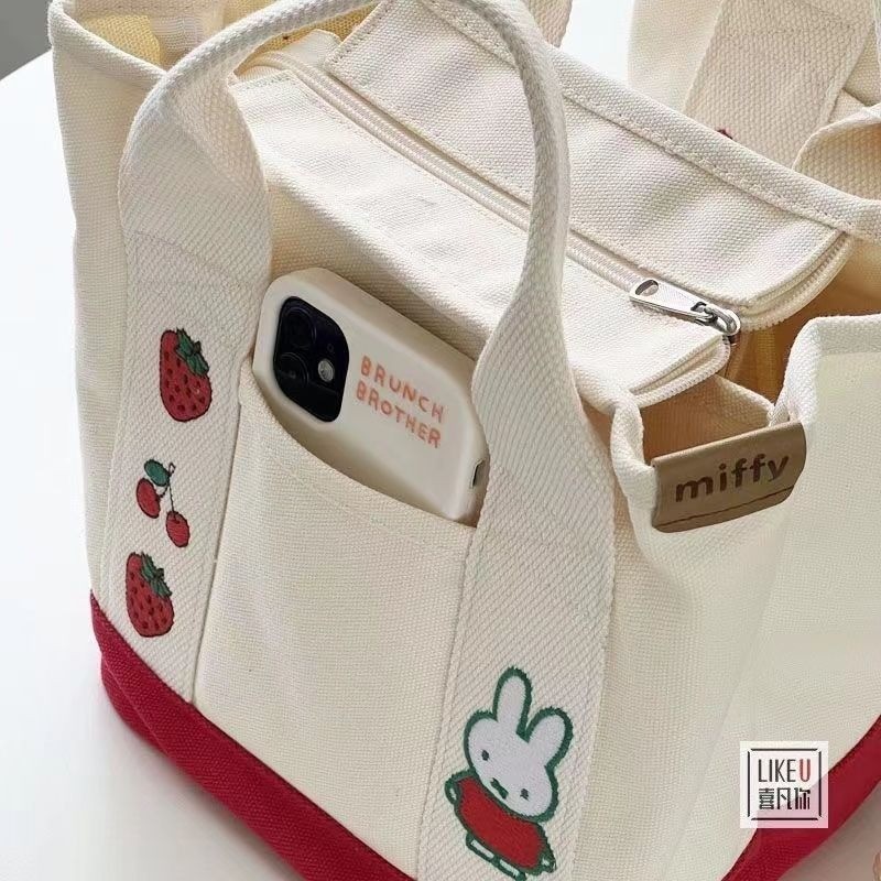 Ielgy Cartoon Strawberry Rabbit Embroidered Canvas Bag Outing Hand Bag Lunch Bag Office Worker Portable Storage Bag