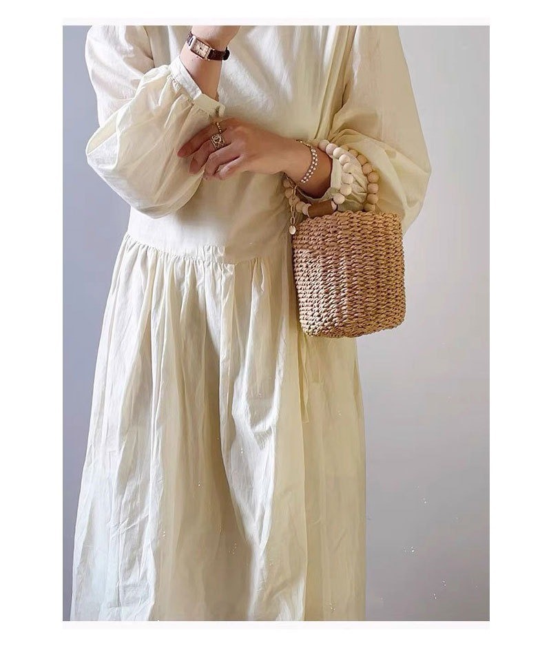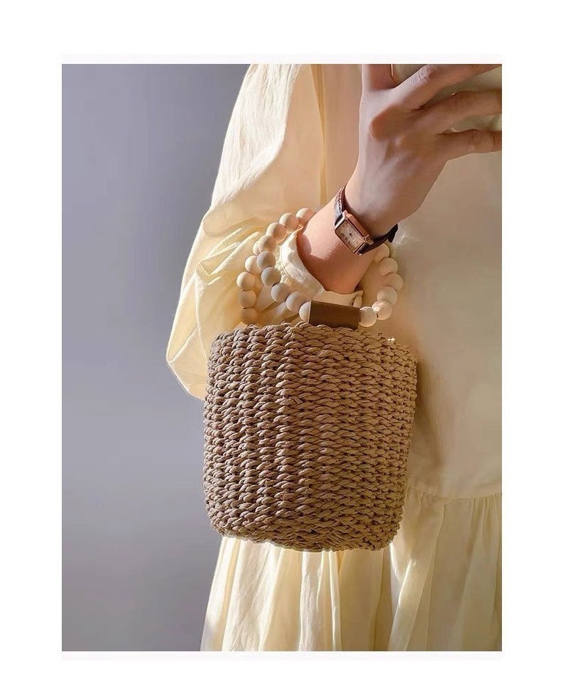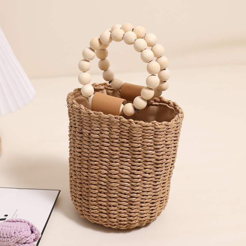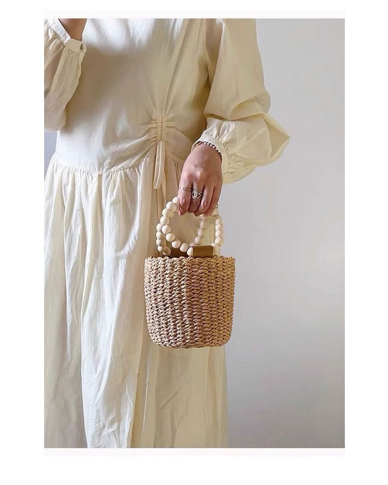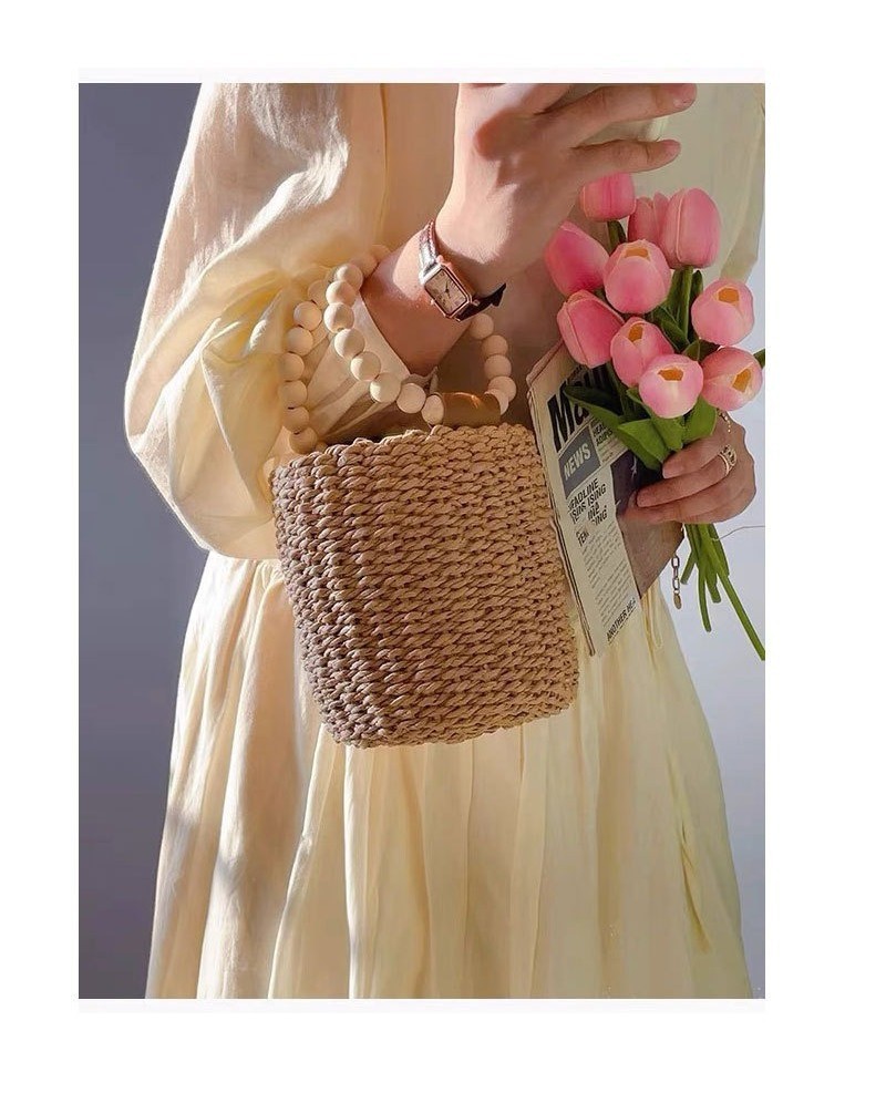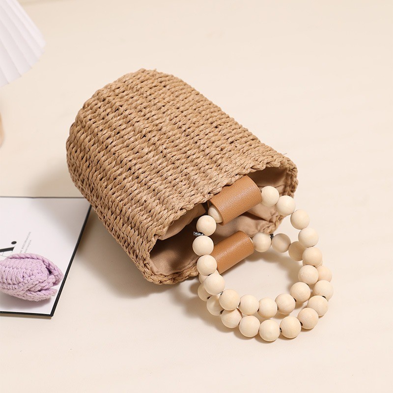 Ielgy Cute Beaded Portable Straw Bucket Bag Hand-Carrying Straw Bag Vacation Style Beach Woven Bag All-Match