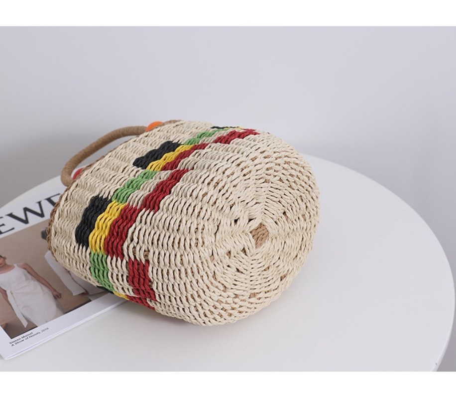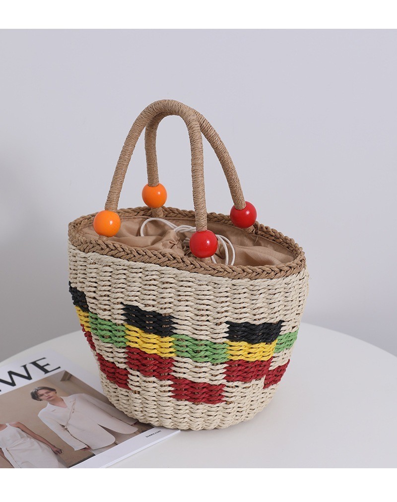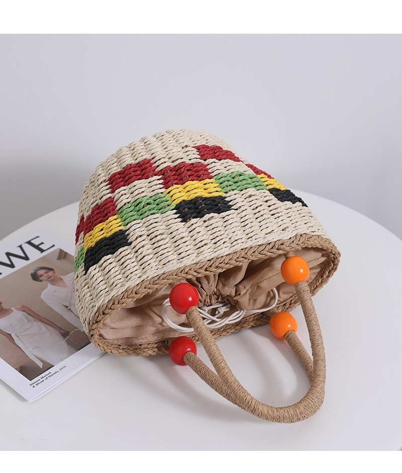 Ielgy Cute Wooden Bead Portable Straw Bag Small Fresh Colorful Lattice Hand-Carrying Woven Bag Fruit Picnic Basket Beach Bag