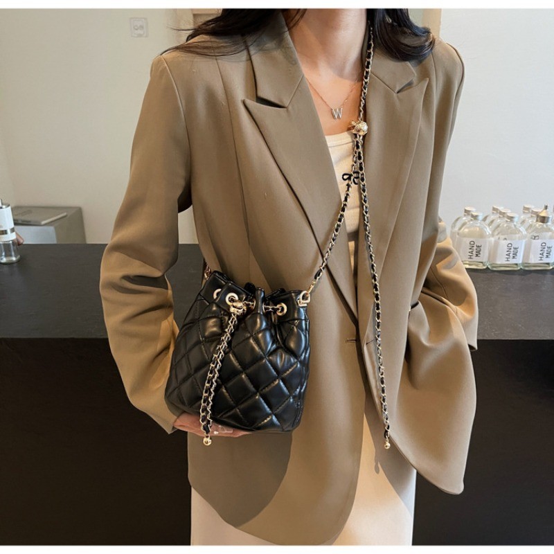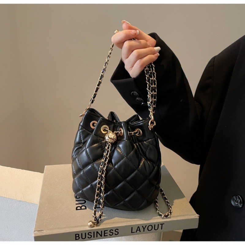 Ielgy Diamond Chain Crossbody Drawstring Bucket Bag Round Barrel Shoulder Bag