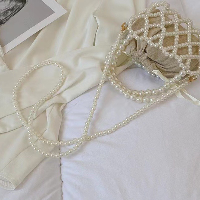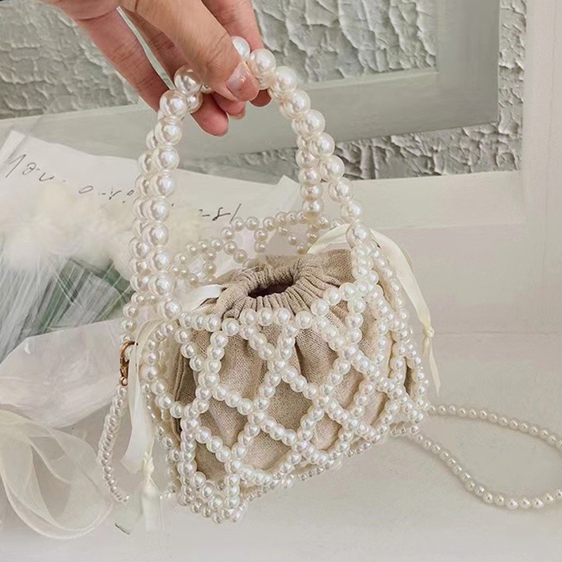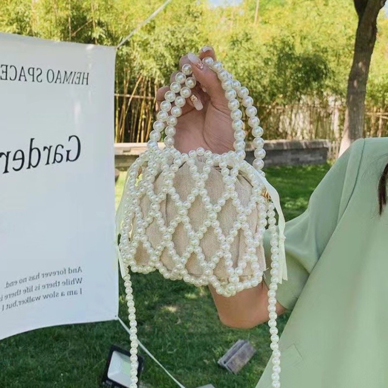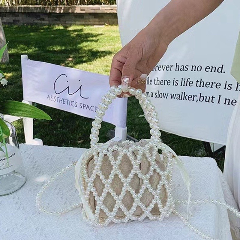 IELGY French Retro Fairy Bag Woven Beaded Bucket Bag Portable Crossbody Bag Summer Xiaozhong Design Hollow Pearl Bag