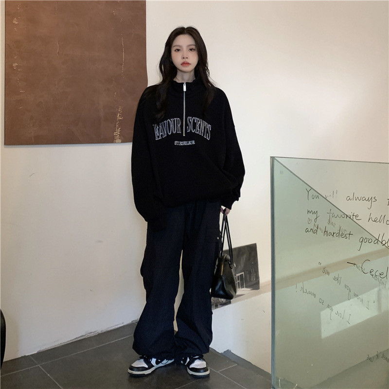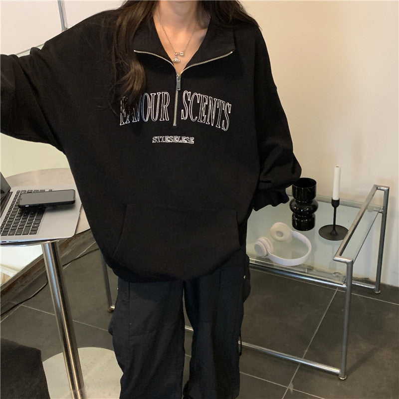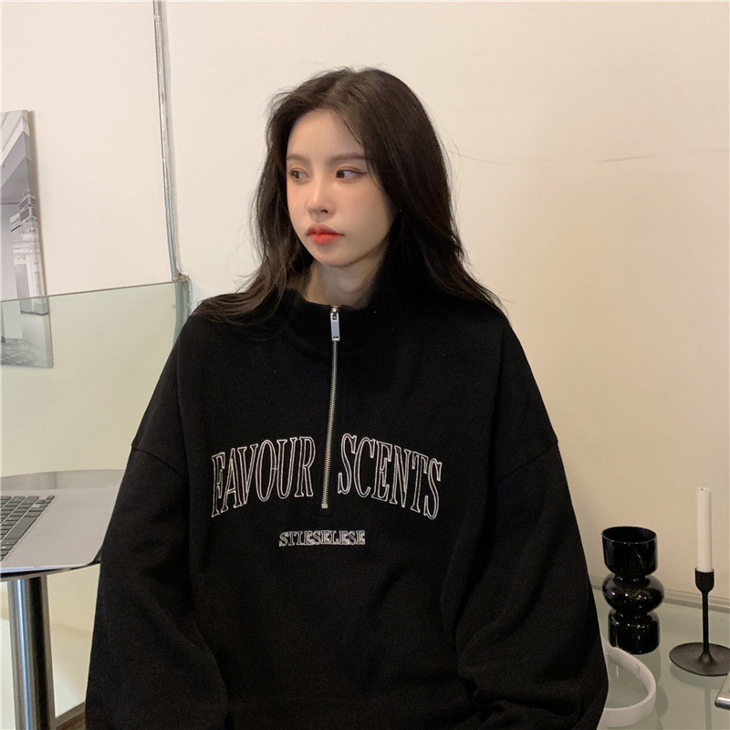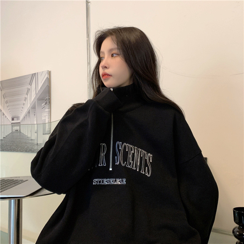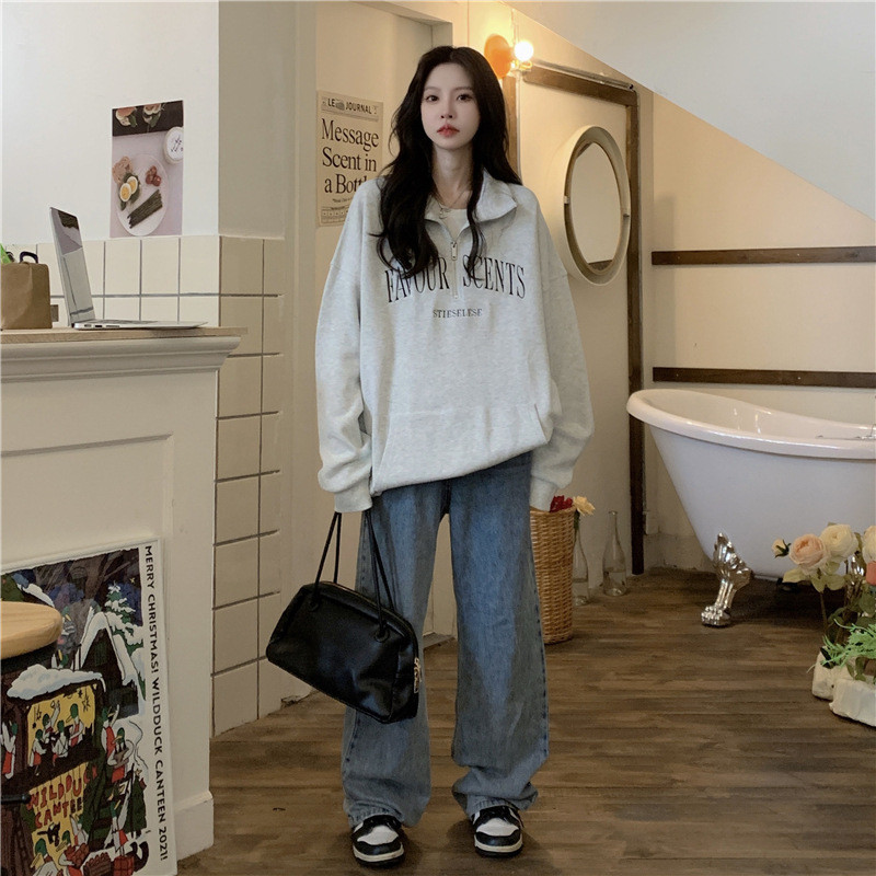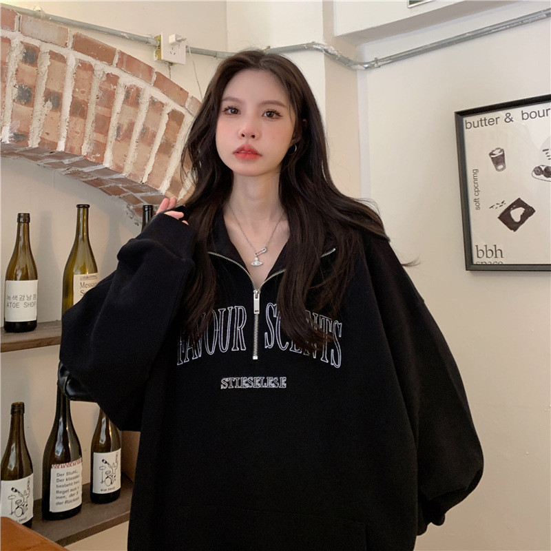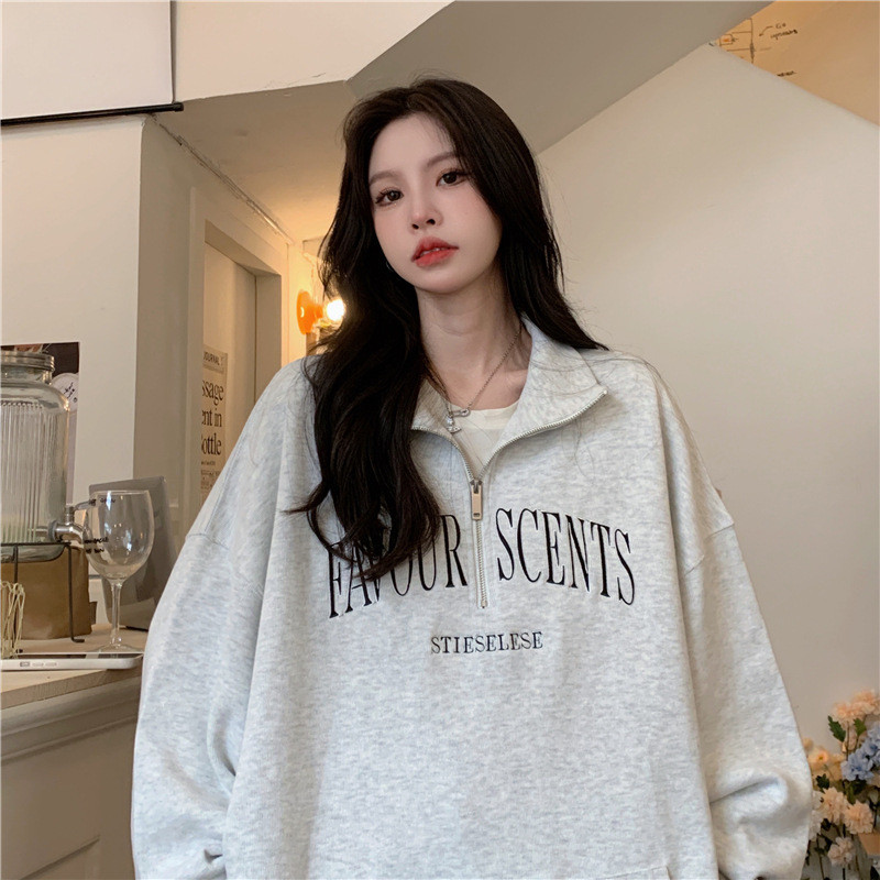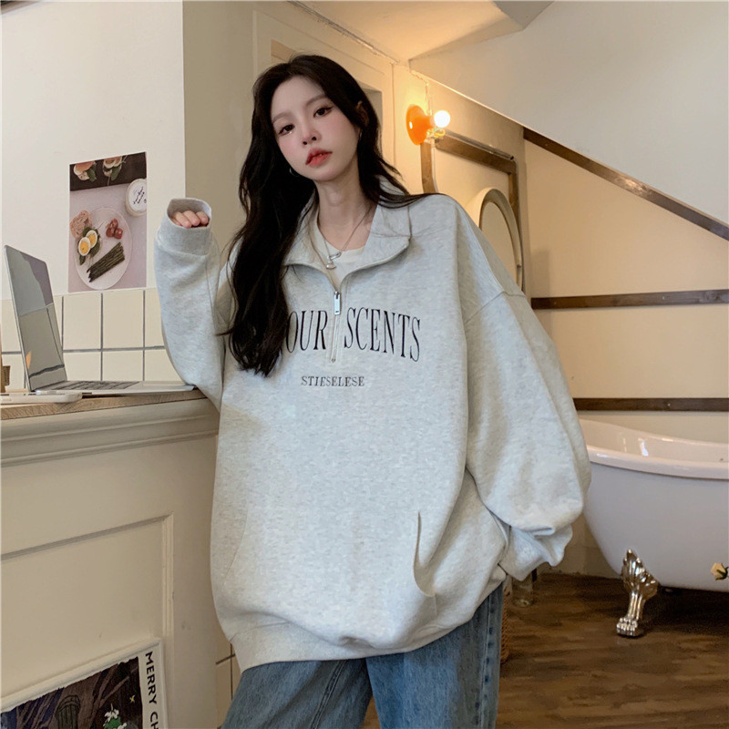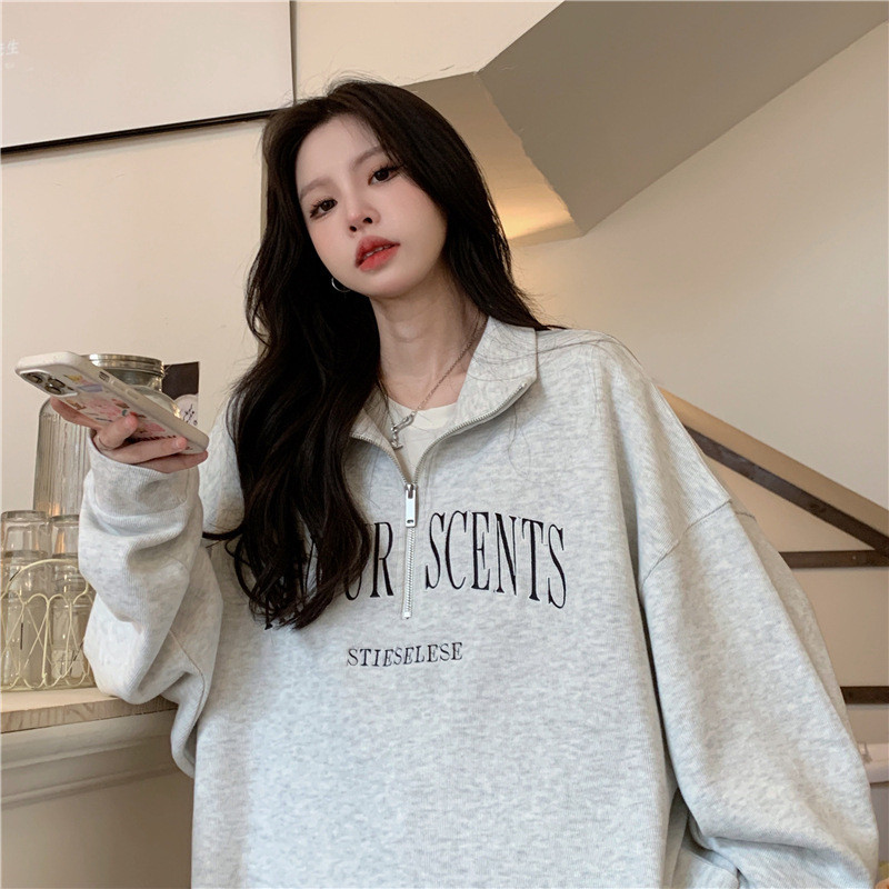 IELGY Grey polo collar sweatshirt women's thin loose oversize zipper top