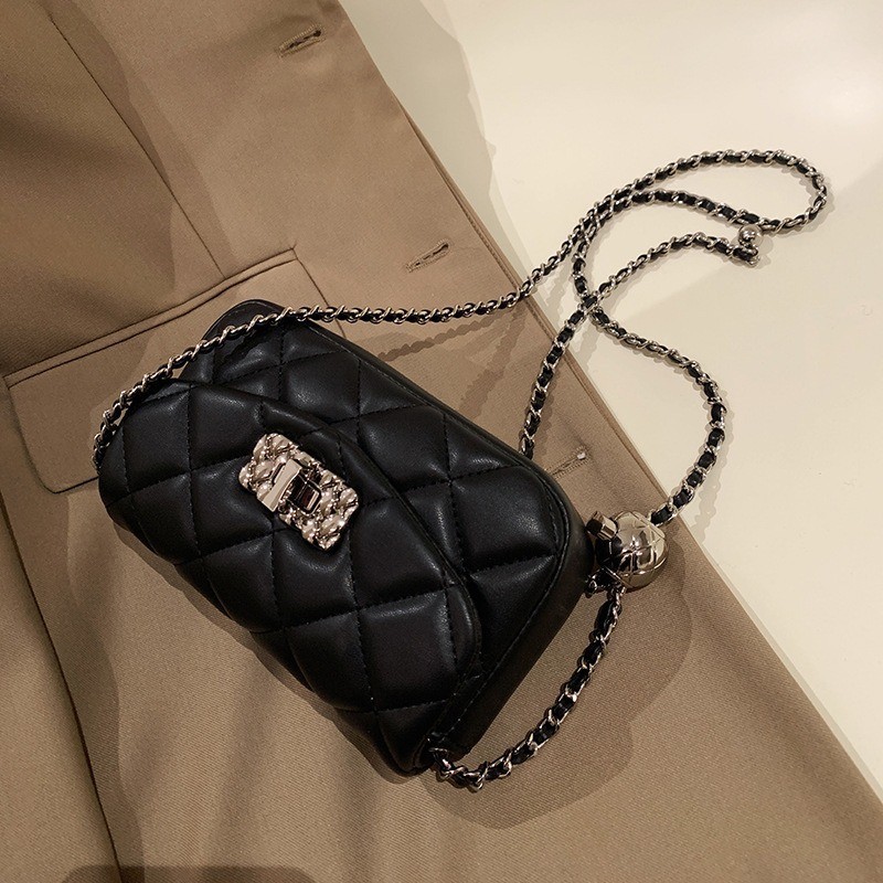 Ielgy Ladies Black Diamond Small Golden Ball Chain Small Square Bag Fashionable All-Match Shoulder Messenger Bag