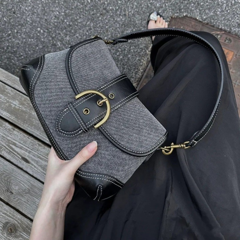 Ielgy Ladies Denim Underarm Bag High-End Texture Niche Commuter Retro Stitching Shoulder Handbag