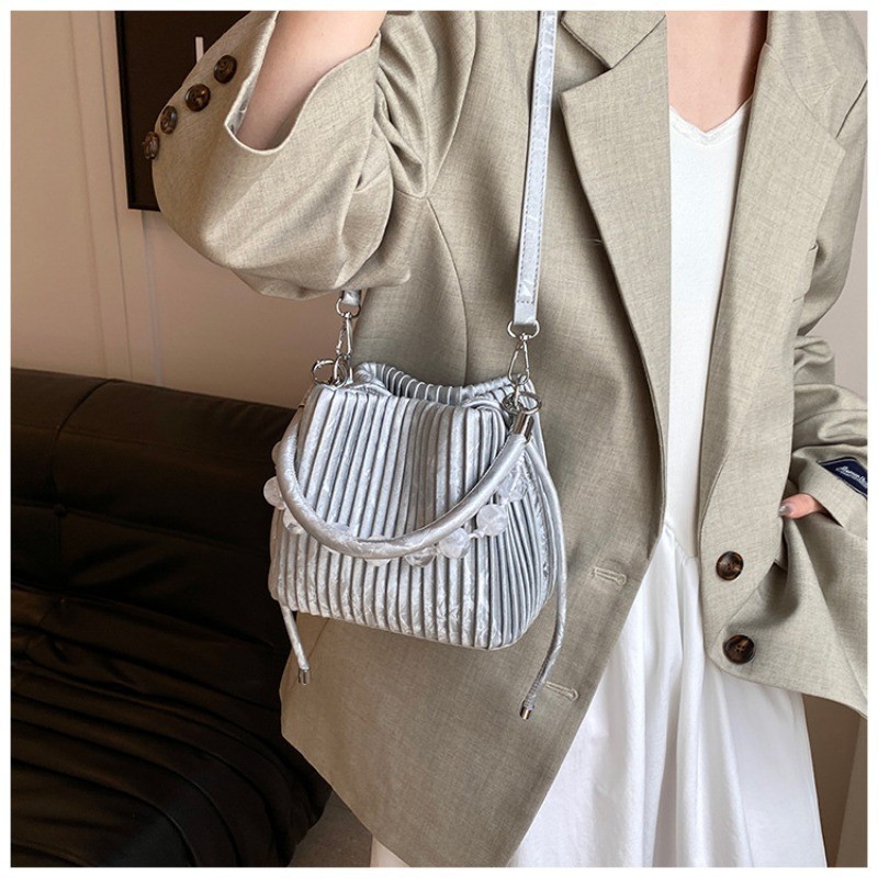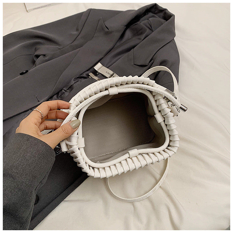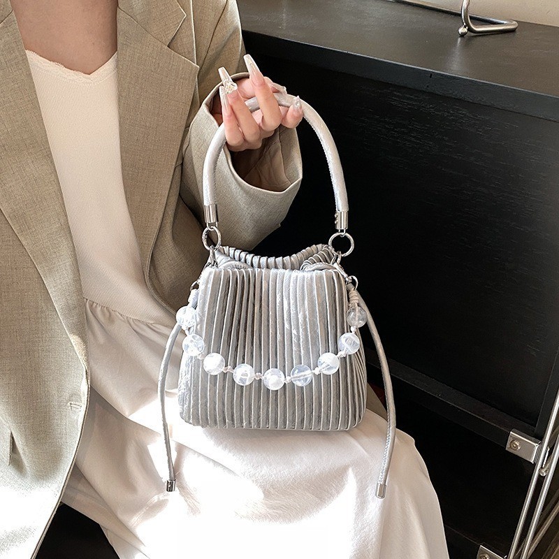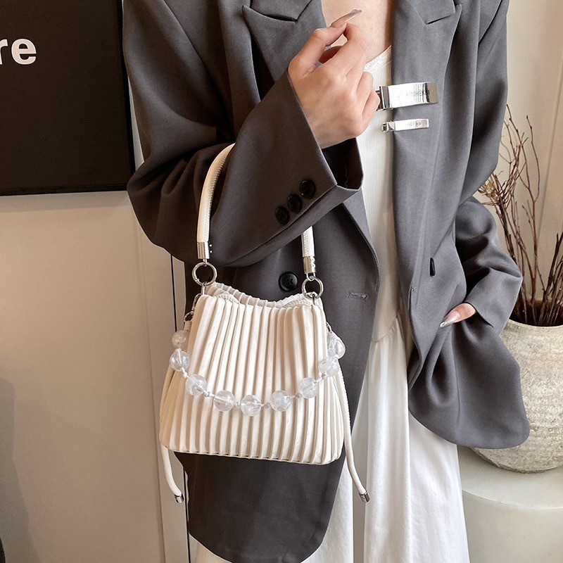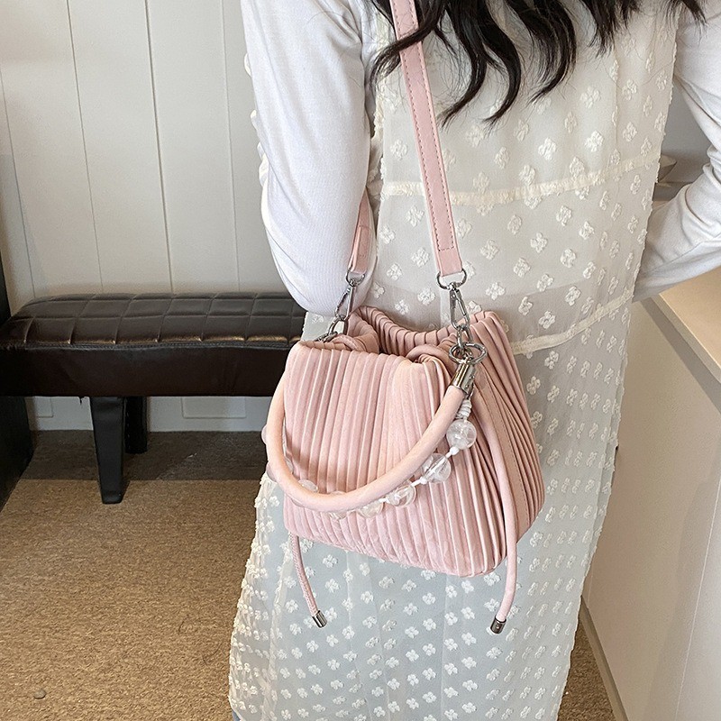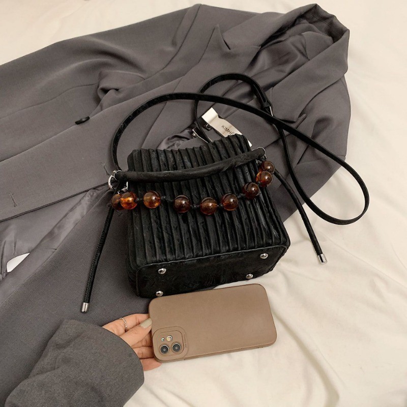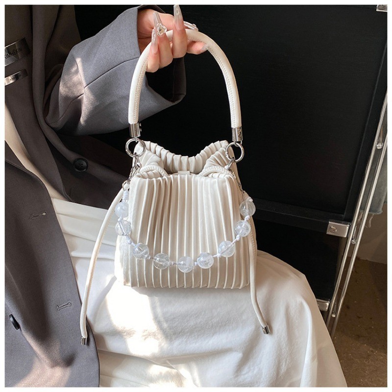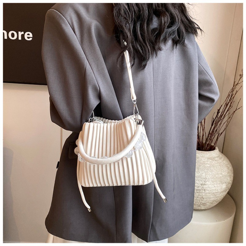 Ielgy Ladies Niche Pleated All-Match Messenger Bag Fashion Beaded Portable Bucket Bag