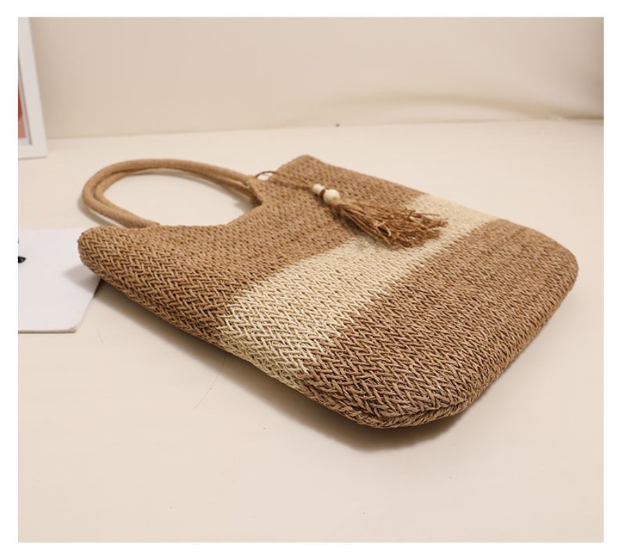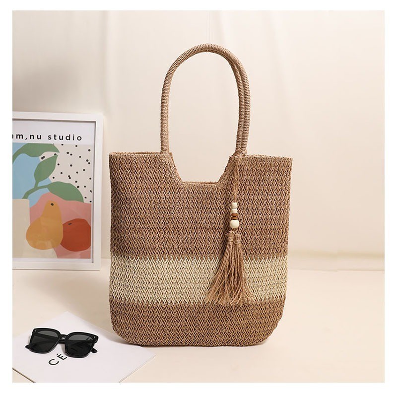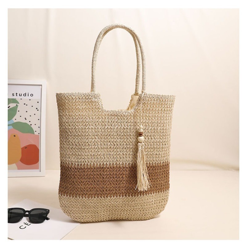Ielgy Ladies Two-Color Tassel Woven Bag Fashion One-Shoulder Casual Straw Beach Bag
