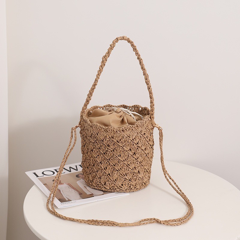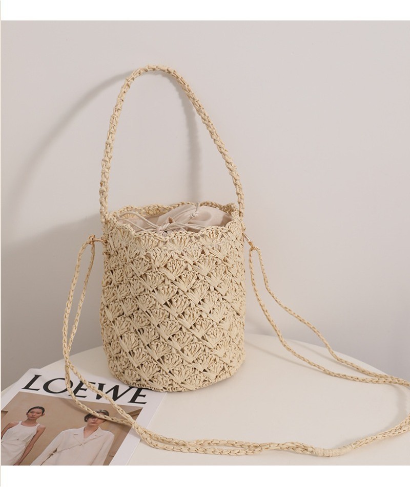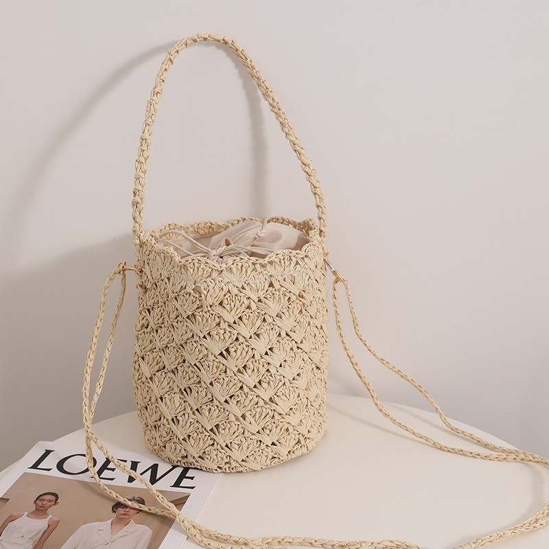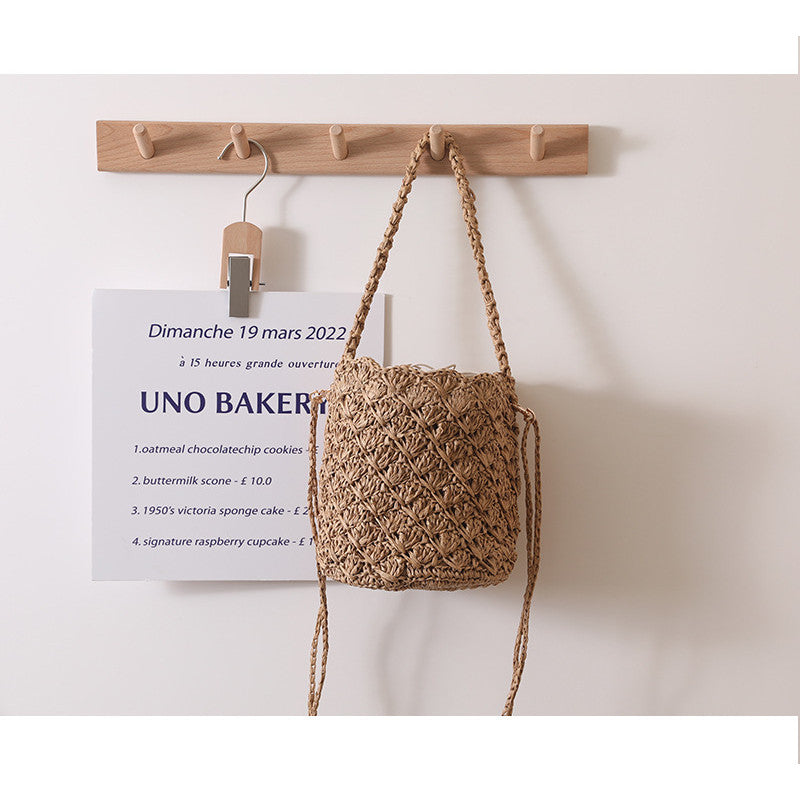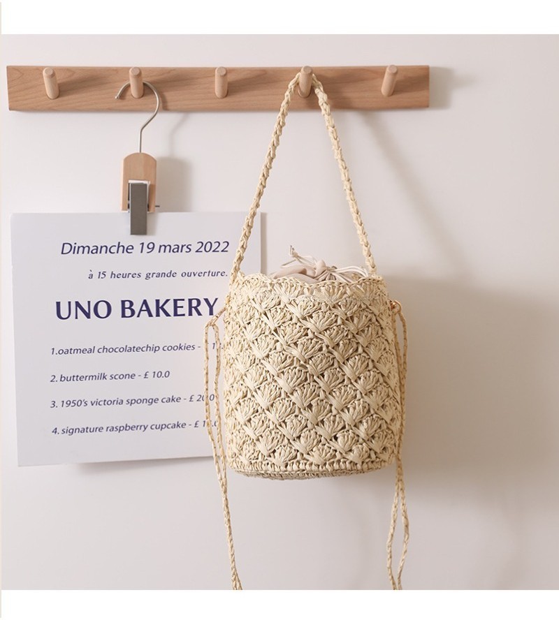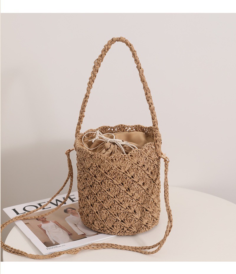 Ielgy Niche Design Straw Bucket Bag French Retro Crossbody Portable Woven Vacation Beach Bag
