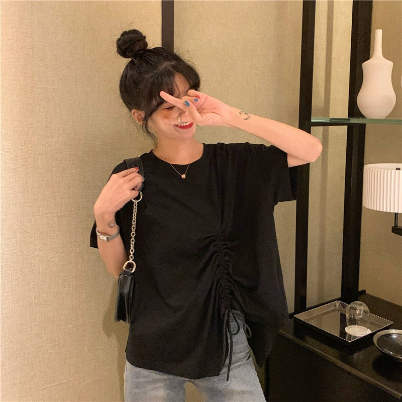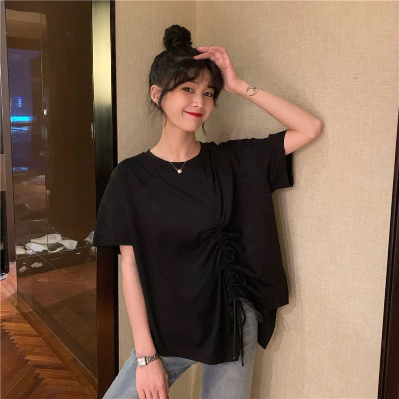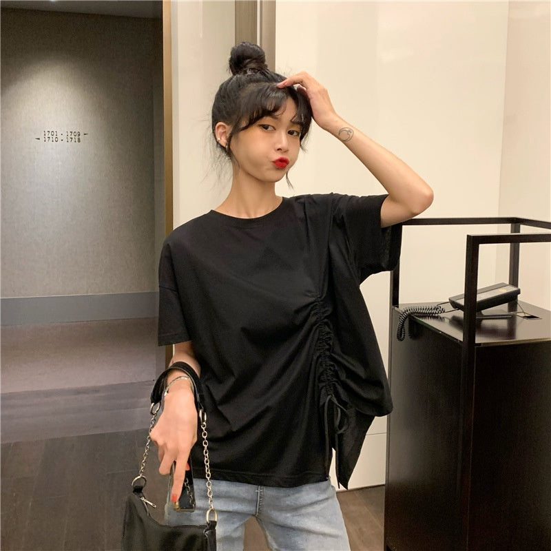 IELGY plus size women's summer drawstring irregular design sense loose short-sleeved t-shirt