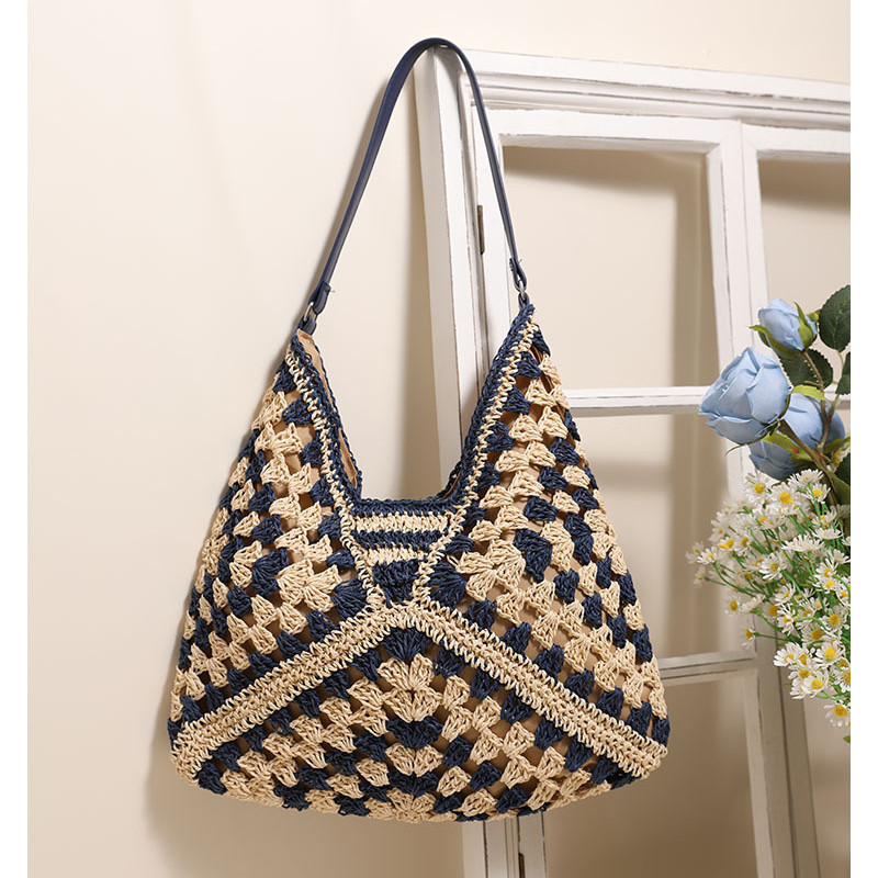 Ielgy Straw Hollow Contrast Color Woven Bag Vacation Beach Bag